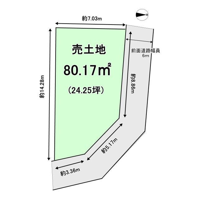 | 土地面積 | 公80.21㎡(24.26坪) | 接道 | 北側(公道)幅 約6.0m 間口 約8.86m 東側(公道)幅 約6.0m 間口 約8.53m |